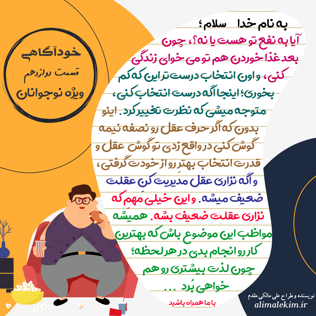 خودآگاهی قسمت دوازدهم 4.8 / 5 ( 149 امتیاز ) عکس نوشته ها 597 بازدید 0خودآگاهی قسمت دوازدهماگر حرف عقل رو نصفه نیمه گوش کنی عقلت ضعیف میشه … khodagahi12